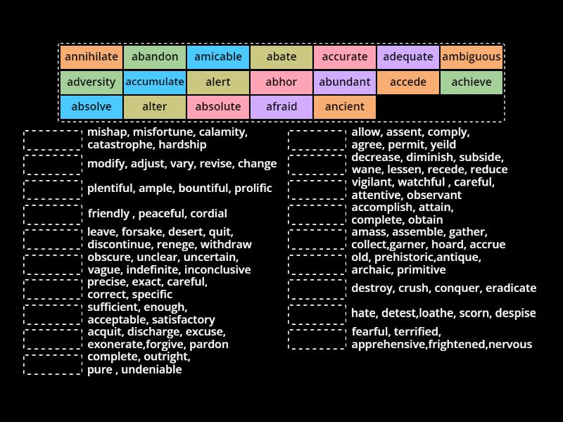 abandon - leave, forsake, desert, quit, discontinue, renege, withdraw, abate - decrease, diminish, subside, wane, lessen, recede, reduce, abhor - hate, detest,loathe, scorn, despise, absolute - complete, outright, pure , undeniable, abundant - plentiful, ample, bountiful, prolific, absolve - acquit, discharge, excuse, exonerate,forgive, pardon, accede - allow, assent, comply, agree, permit, yeild, accumulate - amass, assemble, gather, collect,garner, hoard, accrue, accurate - precise, exact, careful, correct, specific, achieve - accomplish, attain, complete, obtain, adequate - sufficient, enough, acceptable, satisfactory, adversity - mishap, misfortune, calamity, catastrophe, hardship, afraid - fearful, terrified, apprehensive,frightened,nervous, alert - vigilant, watchful , careful, attentive, observant, alter - modify, adjust, vary, revise, change, ambiguous - obscure, unclear, uncertain, vague, indefinite, inconclusive, amicable - friendly , peaceful, cordial, ancient - old, prehistoric,antique, archaic, primitive, annihilate - destroy, crush, conquer, eradicate,