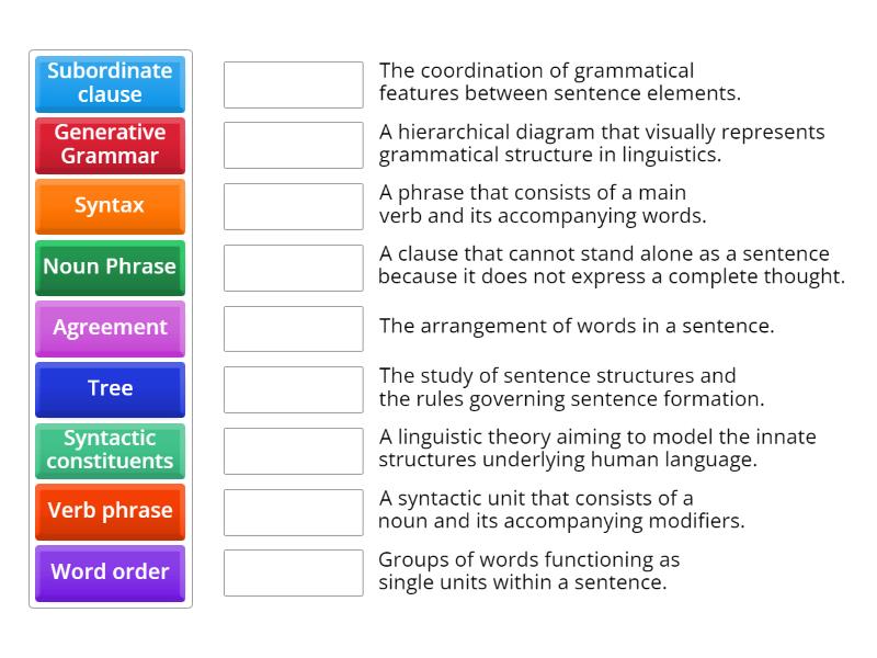 Word order - The arrangement of words in a sentence., Syntax - The study of sentence structures and the rules governing sentence formation., Noun Phrase - A syntactic unit that consists of a noun and its accompanying modifiers., Agreement - The coordination of grammatical features between sentence elements., Subordinate clause - A clause that cannot stand alone as a sentence because it does not express a complete thought., Syntactic constituents - Groups of words functioning as single units within a sentence., Verb phrase - A phrase that consists of a main verb and its accompanying words., Tree - A hierarchical diagram that visually represents grammatical structure in linguistics., Generative Grammar - A linguistic theory aiming to model the innate structures underlying human language.,