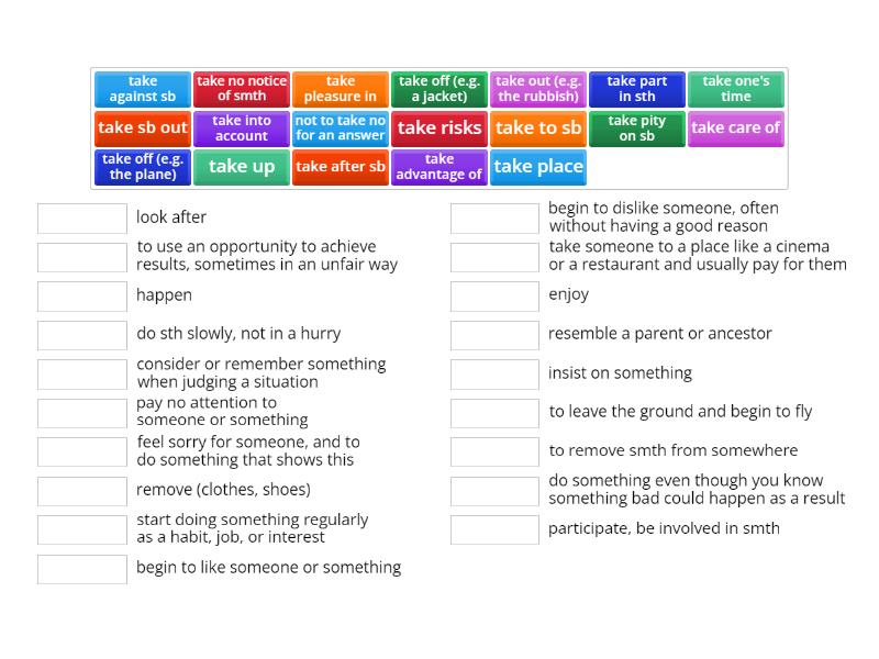 take care of - look after, take advantage of - to use an opportunity to achieve results, sometimes in an unfair way, take place - happen, take one's time - do sth slowly, not in a hurry, take into account - consider or remember something when judging a situation, take no notice of smth - pay no attention to someone or something, take pity on sb - feel sorry for someone, and to do something that shows this, take off (e.g. a jacket) - remove (clothes, shoes), take up - start doing something regularly as a habit, job, or interest, take to sb - begin to like someone or something, take against sb - begin to dislike someone, often without having a good reason, take sb out - take someone to a place like a cinema or a restaurant and usually pay for them, take pleasure in - enjoy, take after sb - resemble a parent or ancestor, not to take no for an answer - insist on something, take off (e.g. the plane) - to leave the ground and begin to fly, take out (e.g. the rubbish) - to remove smth from somewhere, take risks - do something even though you know something bad could happen as a result, take part in sth - participate, be involved in smth,