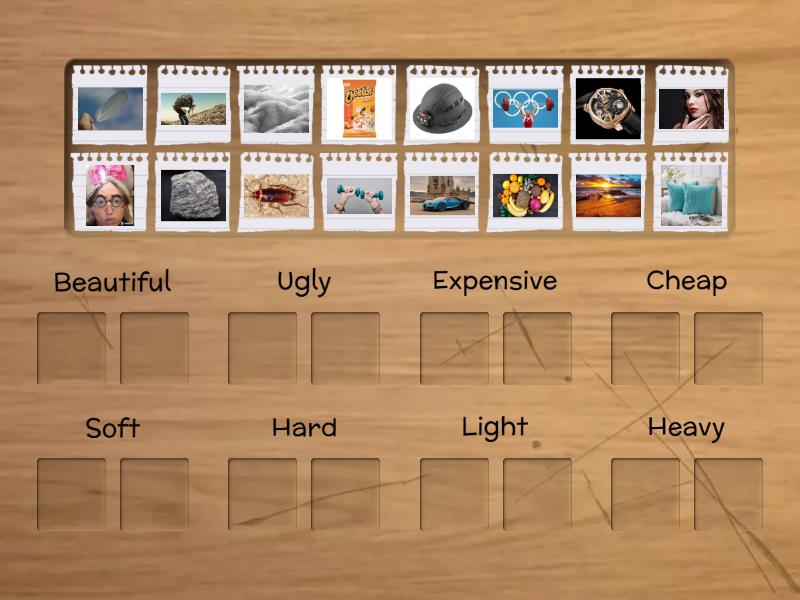 Beautiful: , , Ugly: , , Expensive: , , Cheap: , , Soft: , , Hard: , , Light: , , Heavy: , ,