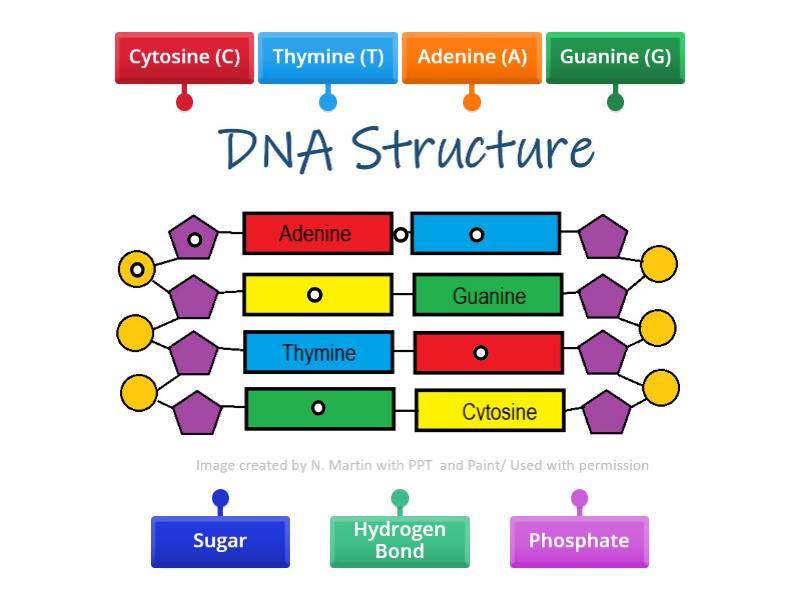 Thymine (T), Cytosine (C), Adenine (A), Guanine (G), Phosphate, Sugar, Hydrogen Bond.