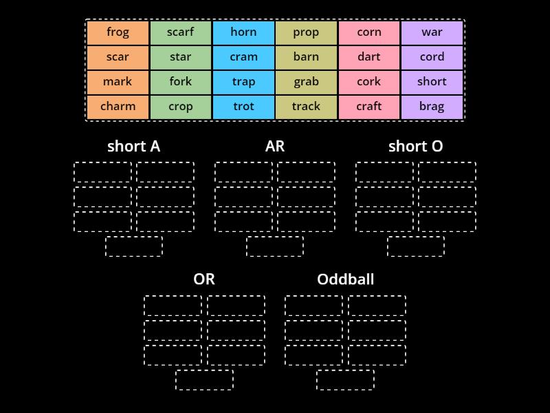 short A: grab, track, trap, cram, craft, brag, AR: star, scar, barn, charm, scarf, mark, dart, short O: frog, prop, crop, trot, OR: fork, corn, cord, horn, cork, short, Oddball: war,