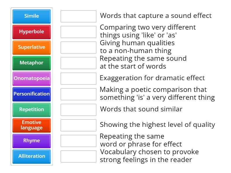 Personification - Giving human qualities to a non-human thing, Repetition - Repeating the same word or phrase for effect, Simile - Comparing two very different things using 'like' or 'as', Metaphor - Making a poetic comparison that something 'is' a very different thing, Alliteration - Repeating the same sound at the start of words, Emotive language - Vocabulary chosen to provoke strong feelings in the reader, Onomatopoeia - Words that capture a sound effect, Rhyme - Words that sound similar, Hyperbole - Exaggeration for dramatic effect, Superlative - Showing the highest level of quality,