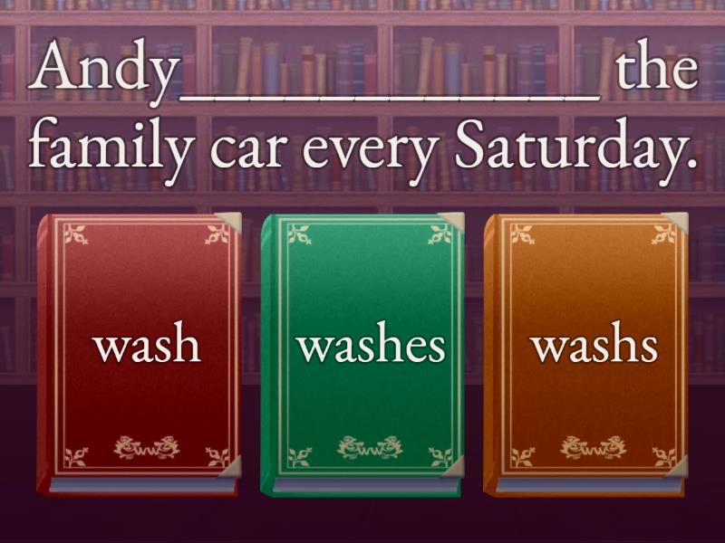 1) Andy____________ the family car every Saturday. a) wash b) washes c) washs 2) Every morning my mother _________ at 6 o'clock. a) get up b) gets ups c) gets up 3) Mr Black __________ e-mails in the evenings. a) write b) writs c) writes 4) 4) The girls _____________ shopping twice a week. a) goes b) go c) gos 5) Mandy and Susan___________ movies every weekend. a) watches b) don't watch c) watching 6) John often_____________ handball. a) play b) playes c) plays 7) My parents ___________ in Boston, they live in New York. a) doesn't live b) don't live c) not live 8) Carlos_____________like pizza. a) don't b) doesn't c) is d) isn't