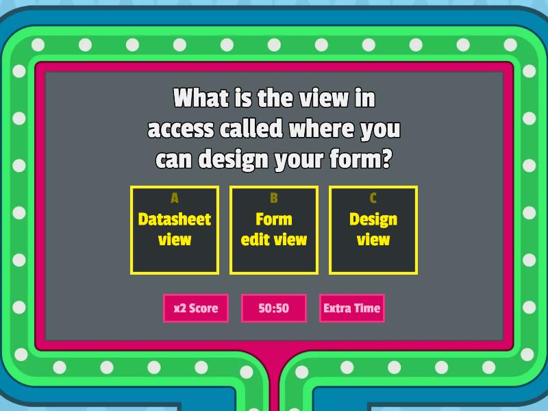 1) What is the view in access called where you can design your form? a) Datasheet view b) Form edit view c) Design view 2) What is the view in access called where you can enter data in your database via a table? a) Field view b) Datasheet view c) Design view 3) How would we validate for Male or Female in gender field of one character? a) M AND F b) M & M c) Male OR Female d) M OR F 4) Why is an autonumber useful? a) It gives every record a unique ID which is required by Access b) It makes you work harder which your teacher likes c) It saves you entering the card name which saves time 5) How might we validate for Strength on a scale of 1 to 100? a) >0 and <101 b) <>0 c) >0 d) >0 or >100 6) What would the correct field type for card number be? a) Long number b) Short Number c) Autonumber 7) Which of these might validate for someone of school age? a) >11 AND <18 b) <11 AND < 18 c) >11 AND >18 d) =11 OR =18 8) What is the correct field type for strength out of 100? a) Number b) Large Number c) Autonumber 9) What is the correct field type for storing an image? a) Image b) Picture c) OLE Object d) Media 10) What might validation of <=Date() do, if Date() gives todays date? a) Only allow dates beyond today's date b) Only allow an entry which is any date c) Only allow dates earlier or equal to today d) Only allow dates which are smaller than today
