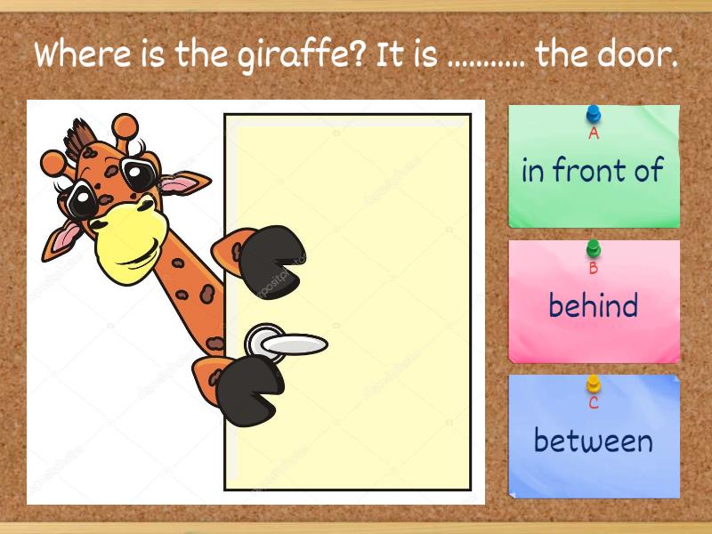 1) Where is the giraffe? It is ........... the door.  a) in front of b) behind  c) between 2) Where is the girl? She is ........... two boys.  a) behind b) between c) in front of 3) Where is the mouse? It is........... the cheese.  a) in front of . b) behind . c) between . 4) Where is the monkey? It is ............. the tree.  a) behind  b) between c) in front of 5) Where is the apple? It is ................. the box.  a) in front of b) between c) behind 6) Where is the bear? It is.............. the table and the box.  a) behind b) in front of c) between