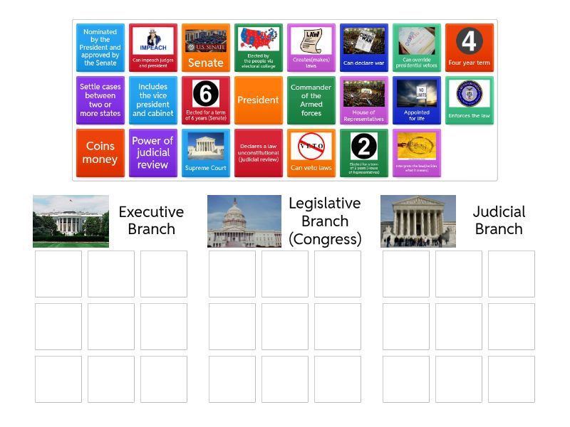 Executive Branch: Enforces the law, President, Can veto laws, Four year term, Elected by the people via electoral college, Includes the vice president and cabinet, Commander of the Armed forces, Legislative Branch (Congress): House of Representatives, Senate, Creates(makes) laws, Can impeach judges and president, Can override presidential vetoes, Elected for a term of 6 years (Senate), Elected for a term of 2 years (House of Representatives), Can declare war, Coins money, Judicial Branch: Supreme Court, Interprets the law(decides what it means), Appointed for life, Power of judicial review, Declares a law unconstitutional (judicial review), Nominated by the President and approved by the Senate, Settle cases between two or more states,