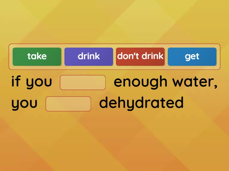 if you ____ enough water, you ____ dehydrated My teacher ____ angry if I ____ If I ____ an English word, I ____ it up in my dictionary If my mom ____ coffee before she goes to bed, she can't ____ If you ____, you ____ the environment If you ____, you ____ your lung If you ____ when you get sick, you ____ better Trees ____ if they ____ enough water. If you ____ red and blue, you ____ purple. If you ____ water, it ____ ice. If my mum ____ a cold, I usually ____ it f you ____ to come, ____ me before 5:00. If cars ____ cheap, people always ____ them.