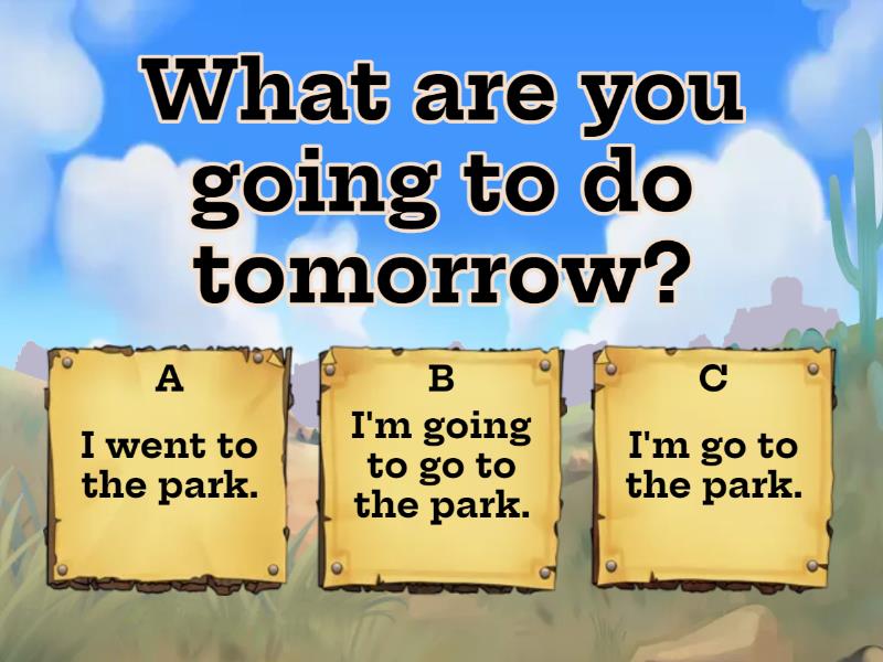 1) What are you going to do tomorrow? a) I went to the park. b) I'm going to go to the park. c) I'm go to the park. 2) What is Robert going to do next week? a) He ride his bike. b) He rode his bike. c) He's going to ride his bike. 3) What did you do last Sunday? a) I went shopping. b) I'm going shopping. c) I go shopping. 4) What did you eat yesterday? a) I ate chicken. b) I eat chicken c) I'm eating chicken. 5) Where did you drive last week? a) We drive to San Jose. b) We drived to San Jose c) We drove to San Jose. 6) Do you have a car? a) Yes I am b) Yes I do. c) Yes I did. 7) Does your brother live in San Rafael? a) Yes he does. b) Yes he do c) Yes he is 8) What is she doing now? a) She studies. b) She studied. c) She is studying. 9) How old is your son? a) He has two years. b) He two years c) He is two years old. 10) What are you doing now? a) I work b) I working c) I'm working 11) Did you wash the dishes last night? a) Yes I do. b) Yes I am c) Yes I did. 12) Where's the notebook? a) Is on the table b) It on the table c) It's on the table 13) What did he do last night? a) He swept the floor b) He is sweeping the floor. c) He sweeped the floor. 14) Did Luis wash the dishes? a) No he didn't. He dried the dishes. b) He no wash the dishes c) He no washed the dishes. 15) What did you do last night? a) I empty the trash b) I emptied the trash. c) I did the trash.