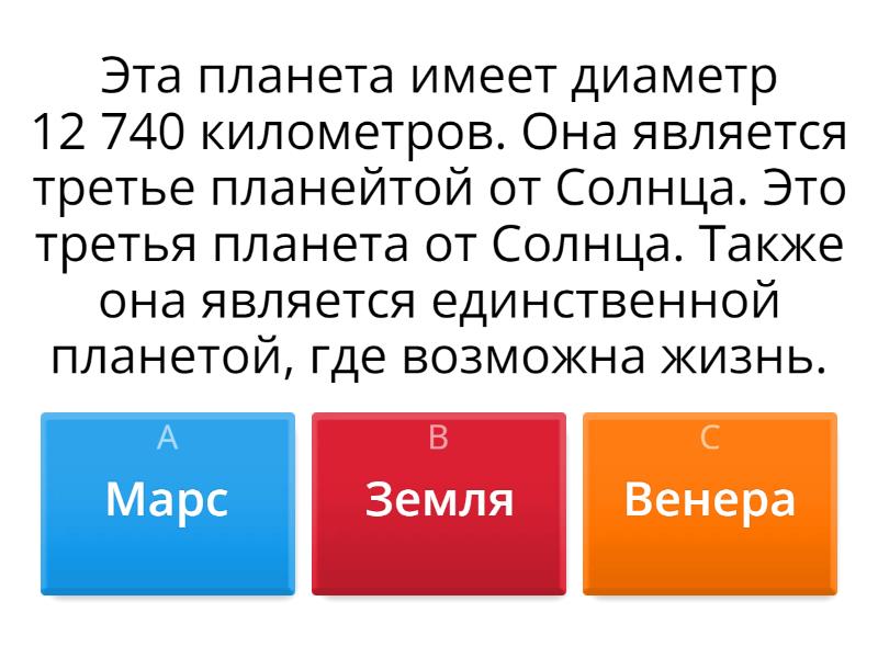 1) Эта планета имеет диаметр 12 740 километров. Она является третье планейтой от Солнца. Это третья планета от Солнца. Также она является единственной планетой, где возможна жизнь. a) Марс b) Земля c) Венера 2) Эта планета самая большая. Ее диаметр в 11 раз больше диаметра Земли, а масса в 318 раз больше массы нашей планеты. Также данная планета в два с половиной раза тяжелее, чем все остальные. a) Меркурий b) Уран c) Юпитер 3) Планету часто называют красной, потому что она содержит большое количество железа, которое окисляясь, дает красный цвет. Также по размерам она в два раза меньше Земли. a) Сатурн b) Марс c) Нептун 4) Эта планета очень горячая. Также она является первой планетой, которую начали изучать люди. По счету находится второй планетой от Солнца. a) Венера b) Уран c) Сатурн 5) Днем на планете жарко, а ночью бывает ледяной дождь. Также она является самой маленькой планетой, потому что ее диаметр достигает 4880 км. a) Земля b) Юпитер c) Меркурий 6) Это планета гигант, ее диаметр равен 49528 км. На планете постоянные свирепствуют штормы, ветра, достигающие скорости больше 600 метров в секунду. a) Юпитер b) Земля c) Нептун 7) Это вторая по величине планета в Солнечной системе. Также есть 82 спутника – это рекордное число. Планета имеет кольца состоящие из обломком льда и камней. a) Сатурн b) Марс c) Нептун 8) Диаметр данной планеты равен 51000 км. Также имеет свою особенность – она вращается лежа на боку. Относится к классу газовых гигантов. a) Меркурий b) Венера c) Уран