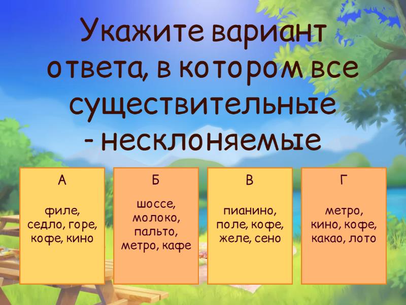 1) Какие существительные называются несклоняемыми? a) которые не изменяются по падежам и числам b) которые не изменяются по родам и числам c) которые не изменяются по падежам и родам d) у которых нельзя определить ни род, ни падеж, ни число 2) Раскройте скобки: "Ребята, почитайте романы зарубежного писателя (Виктор Гюго)" a) Виктор Гюго b) Виктора Гюго c) Виктора Гюга d) Виктор Гюга 3) Раскройте скобки: "Возьмите в библиотеке книгу "Жизнь и удивительные приключения морехода (Робинзон Крузо)" (Даниэль Дефо) a) Робинзона Крузо, Даниэль Дефо b) Робинзон Крузо, Даниэля Дефо c) Робинзона Крузо, Даниэля Дефо d) Робинзон Крузо, Даниэль Дефо 4) Раскройте скобки: "Я люблю читать произведения (Марк Твен, Этель Войнич, Ольга Берггольц)) a) Марк Твена, Этель Войнича, Ольги Берггольца b) Марк Твен, Этель Войнич, Ольга Берггольц c) Марка Твена, Этель Войнич, Ольги Берггольц 5) Укажите вариант ответа, в котором все существительные - несклоняемые a) шоссе, молоко, пальто, метро, кафе b) пианино, поле, кофе, желе, сено c) филе, седло, горе, кофе, кино d) метро, кино, кофе, какао, лото