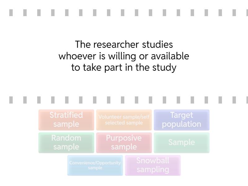 Convenience/Opportunity sample - The researcher studies whoever is willing or available to take part in the study, Purposive sample - A technique used in qualitative research to select a specific group of individuals or units for analysis., Volunteer sample/self selected sample - Participants choose to join the research. The participants can opt to join the research by replying to adverts placed by the researcher about the topic and methods being used., Random sample - Samples are chosen from a population either by using a random number table or a random number generator. Each member of the population has an equal, independent and known chance of being selected., Snowball sampling - Is a recruitment technique in which research participants are asked to assist researchers in identifying other potential subjects., Target population - The group of individuals that the experiment intends to conduct research in and draw conclusions from., Sample - A subset of individuals (a sample) from a larger population, to study and draw inferences about the entire population., Stratified sample - The sample matches the makeup of the population. Participants from subgroups of the population are randomly selected.,