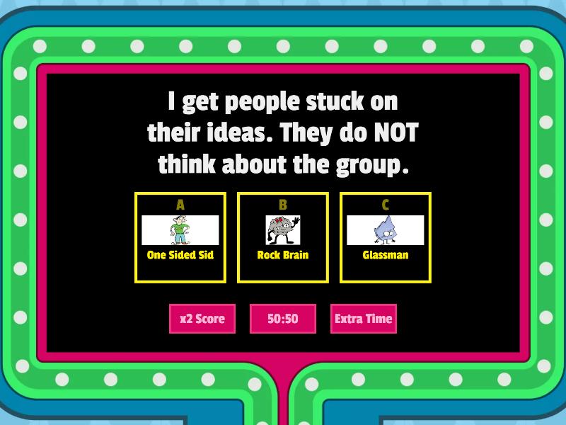 1) I get people stuck on their ideas. They do NOT think about the group. a) One Sided Sid b) Rock Brain c) Glassman 2) I make people have HUGE reactions! Usually he thinks things are not fair a) Destroyer of Fun b) Mean Jean c) Glassman 3) I get people to act mean and bossy a) Mean Jean b) Glassman c) One Sided Sid 4) I distract people! a) Brain Eater b) Was Funny Once c) Grump Grumpaniny 5) I make people overly competitive. a) Brain Eater b) Destroyer of Fun c) Grump Grumpaniny 6) I get people to use humor at the wrong time, the wrong place or with the wrong person. a) Was Funny Once b) Grump Grumpaniny c) Worry Wall 7) I put people in grumpy moods. a) Topic Twistermeister b) Worry Wall c) Grump Grumpaniny 8) I make people worry too much. a) Worry Wall b) Topic Twister Meister c) Un-Wonderer 9) I make people jump off topic. a) Topic Twister Meister b) Un-Wonderer c) Body Snatcher 10) I don’t like people to socially wonder. a) Body Snatcher b) Un-Wonderer c) Destroyer of Fun 11) I move people’s bodies from the group. a) One Sided Sid b) Energy Hare-y c) Body Snatcher 12) I give people way too much energy. a) One Sided Sid b) Energy Hare-y c) Space Invader 13) I get people to invade other’s personal space. a) Space Invader b) Destroyer of Fun c) Brain Eater 14) I get people to only talk about themselves. a) Body Snatcher b) Mean Jean c) One-Sided Sid