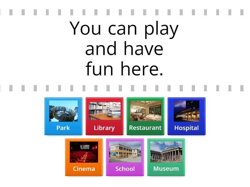 Park - You can play and have fun here., Library - You can read books in this place., Cinema - You can watch a film here., Restaurant - You can eat lunch or dinner there., School - You have classes there., Hospital - Doctors work here., Museum - You can see paintings there.,
