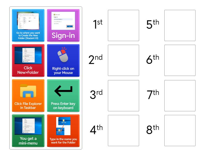 Sign-in, Click File Explorer in Taskbar, Go to where you want to Create the New Folder (Student ID), Right-click on your Mouse, You get a mini-menu, Click New>Folder, Type in the name you want for the Folder, Press Enter key on keyboard.