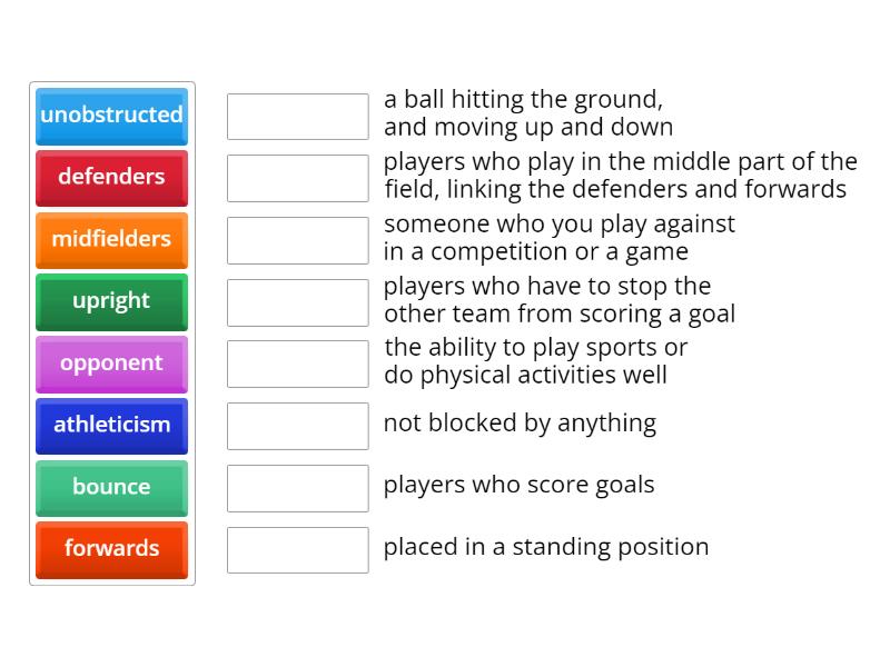 athleticism - the ability to play sports or do physical activities well, bounce - a ball hitting the ground, and moving up and down, unobstructed - not blocked by anything, upright - placed in a standing position, opponent - someone who you play against in a competition or a game, defenders - players who have to stop the other team from scoring a goal, midfielders - players who play in the middle part of the field, linking the defenders and forwards, forwards - players who score goals,
