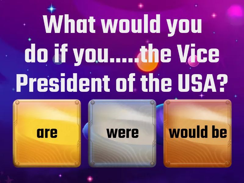 1) What would you do if you.....the Vice President of the USA? a) are b) were c) would be 2) If you.....a competition, would you buy an expensive car? a) win b) would win c) won 3) If I ...... work, I'll visit you at the weekned. a) didn't have to b) don't have to c) wouldn't have to 4) If you ....... too much sugary drinks, you can have stomachache. a) will drink b) would drink c) drink 5) If the weather ..... nice next weekend, we'll go kiting. a) is b) was c) would be 6) If your boss .....you to work all weekend, what would you answer? a) asks b) asked c) would ask 7) If I went to Paris, I .....the Eiffel Tower. a) would visit b) visited c) visit 8) If you ...... a lot of junk food, you get fat. a) ate b) will eat c) eat 9) What ..... next summer, if you .... your final exam? a) will you do ... don't pass b) will you do.... wouldn't pass c) would you do.... didn't pass d) are you doing ...... don't pass 10) If you don't water your plants, they ....... a) died b) dies c) will die