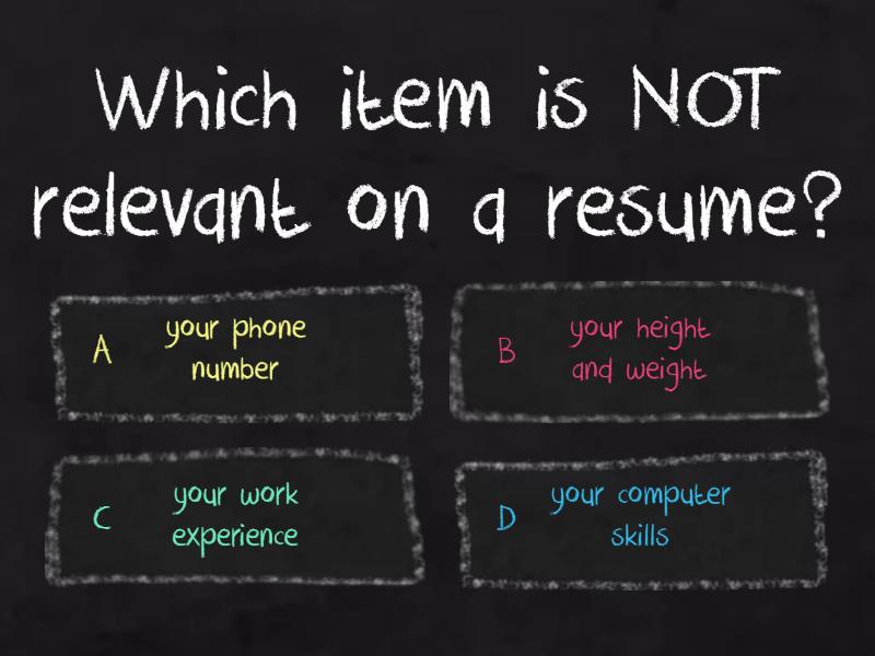 1) Which item is NOT relevant on a resume? a) your phone number b) your height and weight c) your work experience d) your computer skills 2) You are sending an application and resume to a hair salon, which item is NOT relevant? a) strong client interaction b) certification in hairdressing c) you can speak Spanish and French d) you have cooking skills 3) You are sending an application and resume to work in a car shop, which item is NOT relevant? a) Automotive Mechanic Certification b) strong problem-solving skills c) lifeguard certification d) job shadowing at Fred Beans 4) You are sending an application and resume to work at a company as a computer technician, which item is NOT relevant? a) good at online gambling b) strong communication skills c) Microsoft Office certification d) ability to analyze and troubleshoot