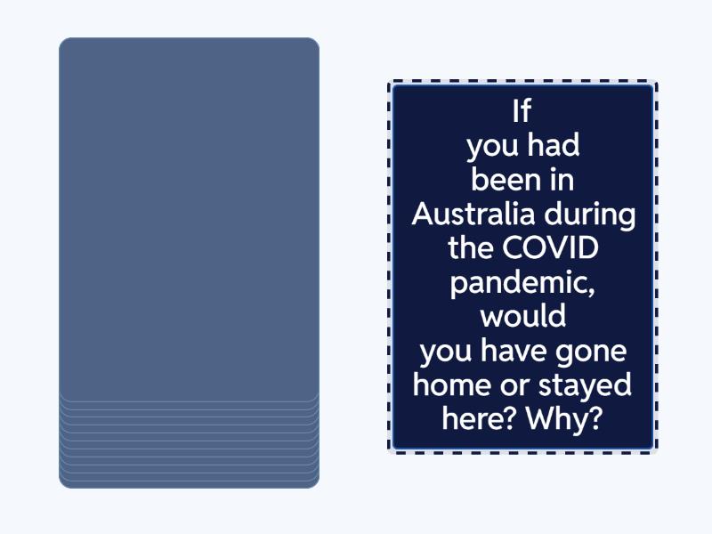 If you hadn't come to class today, what might you have done instead?, If you hadn't come to Australia, where would you have gone?, If you hadn't spoken a word of English, how would you have communicated on your first day in Australia?, If you had got lost on your first day of class, who would you have asked for help?, If you hadn't found a job, what could you have done to save money?, If you hadn't found a house, where could you have lived?, If you had run out of money after a month in Australia, what would you have done?, If you had been in Australia during the COVID pandemic, would you have gone home or stayed here? Why?, If your student visa hadn't been approved, what would you have done?, If your best friend had decided to come live in Australia with you, how would you have felt?, If you had studied English from a young age, would you have come to study in Australia?, If you had a million dollars, where would you have travelled to?, I you hadn't chosen English, which language would you have studied?.