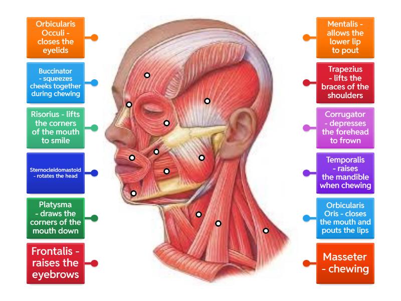 Orbicularis Oris - closes the mouth and pouts the lips, Frontalis - raises the eyebrows, Orbicularis Occuli - closes the eyelids , Platysma - draws the corners of the mouth down, Corrugator - depresses the forehead to frown, Sternocleidomastoid - rotates the head , Risorius - lifts the corners of the mouth to smile, Masseter - chewing, Temporalis - raises the mandible when chewing, Buccinator - squeezes cheeks together during chewing, Trapezius - lifts the braces of the shoulders, Mentalis - allows the lower lip to pout.