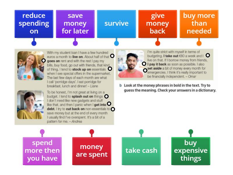 survive , money are spent, buy more than needed, buy expensive things, spend more then you have, reduce spending on , take cash, give money back, save money for later.