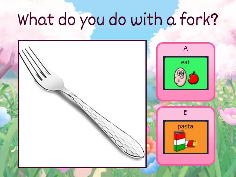 1) What do you do with a fork? a) b) 2) What do you do in a car? a) b) 3) What do you do with a ball? a) b) 4) What do you do with money? a) b) 5) What do you do in a chair? a) b) 6) What do you do with a hat? a) b) 7) What do you do in a bed? a) b) 8) What do you do with a pencil? a) b) 9) What do you do in a pool? a) b) 10) What do you do with scissors? a) b)