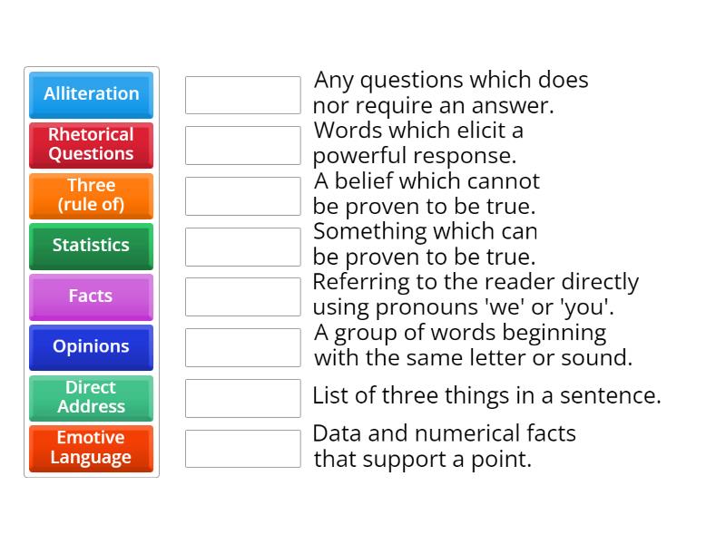 Direct Address - Referring to the reader directly using pronouns 'we' or 'you'., Alliteration - A group of words beginning with the same letter or sound., Facts - Something which can be proven to be true., Opinions - A belief which cannot be proven to be true. , Rhetorical Questions - Any questions which does nor require an answer., Emotive Language - Words which elicit a powerful response., Statistics - Data and numerical facts that support a point., Three (rule of) - List of three things in a sentence.,