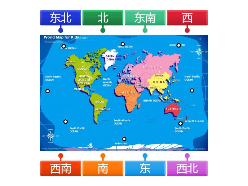 东, 西, 南, 北, 西北, 东北, 东南, 西南.