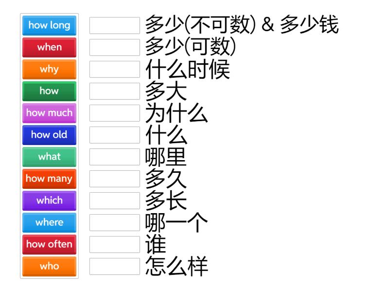 why - 为什么, where - 哪里, what - 什么, when - 什么时候, who - 谁, which - 哪一个, how - 怎么样, how long - 多长, how often - 多久, how many - 多少(可数), how much - 多少(不可数) & 多少钱, how old - 多大,