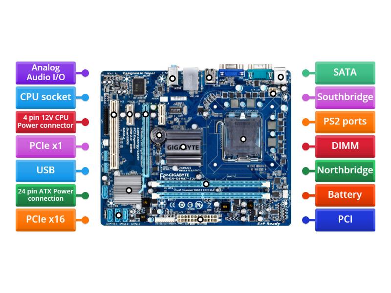 CPU socket, DIMM, PCIe x16, Northbridge, Southbridge, PCI, SATA, Battery, Analog Audio I/O, USB, 4 pin 12V CPU Power connector, PS2 ports, 24 pin ATX Power connection, PCIe x1.