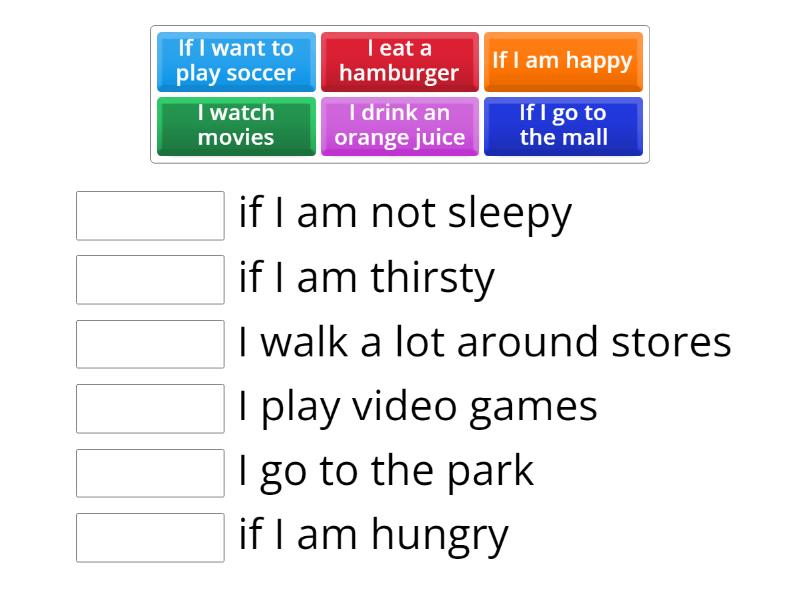 If I am happy - I play video games, I eat a hamburger - if I am hungry, If I want to play soccer - I go to the park, I drink an orange juice - if I am thirsty, If I go to the mall - I walk a lot around stores, I watch movies - if I am not sleepy,