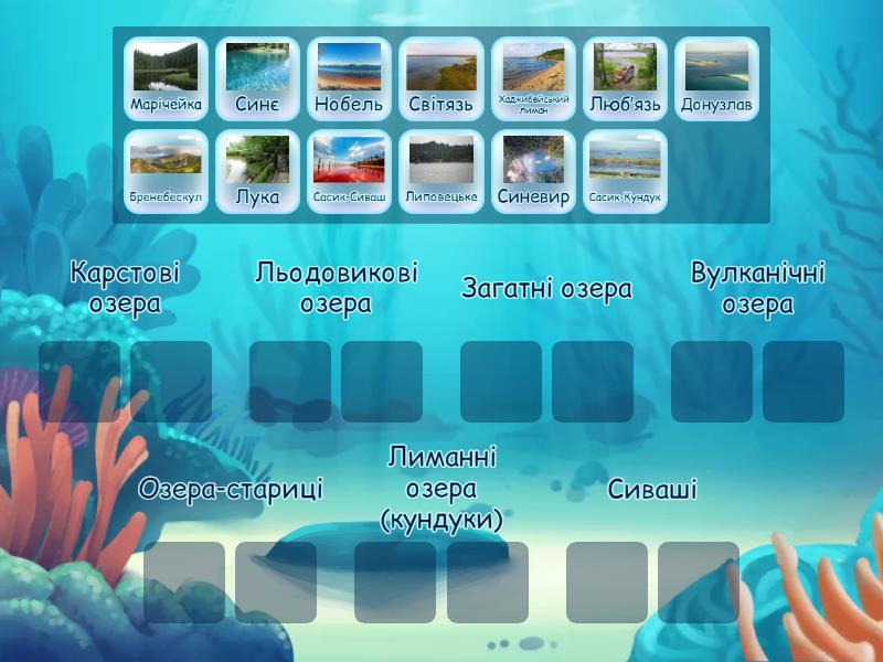 Карстові озера: Світязь, Лука, Льодовикові озера: Бренебескул, Марічейка, Загатні озера: Синевир, Вулканічні озера: Синє, Липовецьке, Озера-стариці: Люб'язь, Нобель, Лиманні озера (кундуки): Сасик-Кундук, Хаджибейський лиман, Сиваші: Сасик-Сиваш, Донузлав,