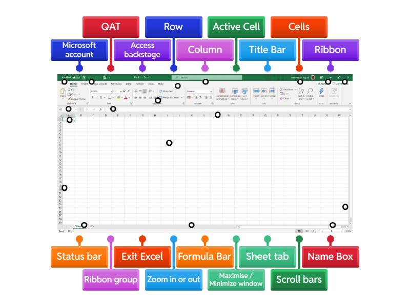 Title Bar, Name Box, Formula Bar, Active Cell, Column, Row, Sheet tab, Cells, Ribbon, Zoom in or out, QAT, Status bar, Scroll bars, Ribbon group, Microsoft account, Maximise / Minimize window, Exit Excel, Access backstage.
