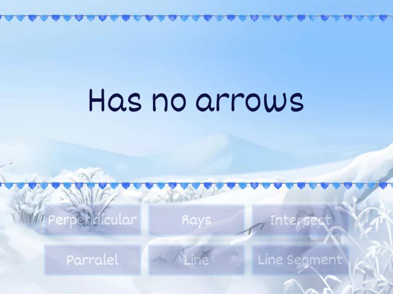 Line Segment - Has no arrows, Line - Has arrows on both sides, Rays - Has only one arrow on one side, Perpendicular - Has a 90 degrees angle, Intersect - Two lines touching each other, Parralel - Two lines with the same distance,