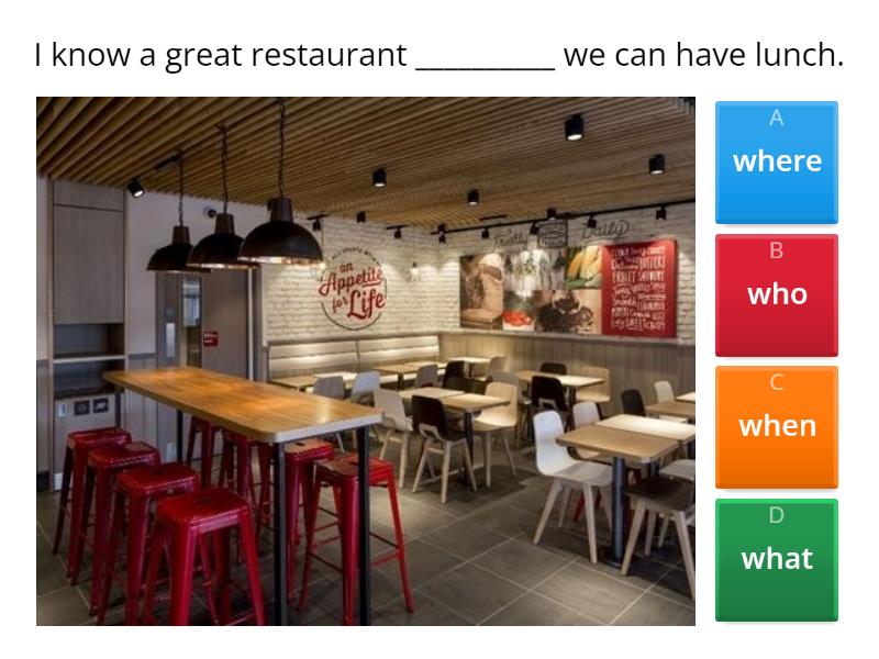 1) I know a great restaurant __________ we can have lunch. a) where b) who c) when d) what 2) Students _______ study hard get good grades. a) which b) whose c) where d) who 3) Food _____ is imported from other countries is expensive. a) which b) where c) what d) who 4) The cookies _________ you baked are really delicious. a) when b) where c) which d) why 5) I visited my uncle ________ lives in Arequips. a) who b) whose c) what d) where 6) the movie _____ we saw last week won three awards. a) who b) where c) that d) which 7) Mario is the man ......... wrote many books a) who b) when c) which d) where 8) Can I borrow the book _________ you bought last month? a) which b) when c) who d) whose 9) My home is a place _________ I can go to relax every day. a) where b) when c) what d) who 10) Who is the teacher ________ you talked to this morning? a) whose b) who c) where d) which