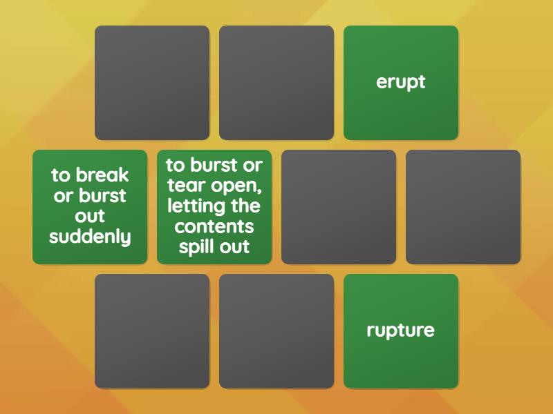 rupture - to burst or tear open, letting the contents spill out, erupt - to break or burst out suddenly, disruptive - causing or caused by turmoil or disorderly behavior, interrupt - to cause to stop; break off, abrupt - sudden and not expected,