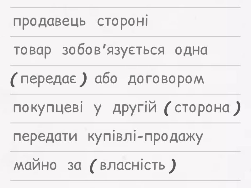за договором купівлі-продажу одна сторона (продавець) передає або зобов'язується передати майно (товар) у власність другій стороні (покупцеві), за договором найму (оренди) наймодавець передає або зобов'язується передати наймачеві майно у володіння та користування за плату на певний строк., за договором дарування одна сторона (дарувальник) передає або зобов'язується передати в майбутньому другій стороні (обдаровуваному) безоплатно майно (дарунок) у власність,