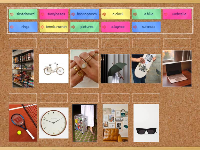 a laptop, sunglasses, a clock, boardgames, pictures, a bike, rings, suitcase, tennis racket, skateboard, umbrella,
