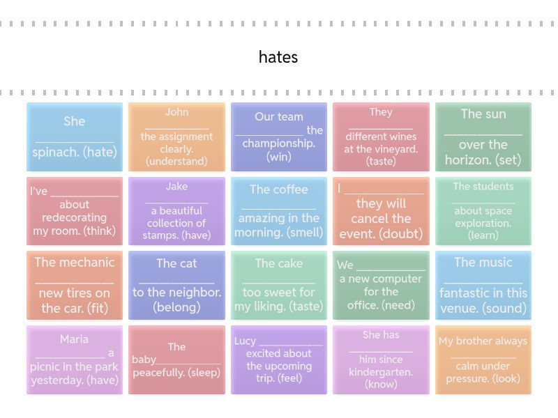 She ____________ spinach. (hate) - hates, The baby____________ peacefully. (sleep) - is sleeping, John ____________ the assignment clearly. (understand) - understands, We ____________ a new computer for the office. (need) - need, Maria ____________ a picnic in the park yesterday. (have) - was having, The cat ____________ to the neighbor. (belong) - belongs, The students ____________ about space exploration. (learn) - are learning, I ____________ they will cancel the event. (doubt) - doubt, Jake ____________ a beautiful collection of stamps. (have) - has, The coffee ____________ amazing in the morning. (smell) - smells, They ____________ different wines at the vineyard. (taste) - are tasting, My brother always ____________ calm under pressure. (look) - looks, The sun ____________ over the horizon. (set) - sets, She has ____________ him since kindergarten. (know) - known, Our team ____________ the championship. (win) - is winning, The cake ____________ too sweet for my liking. (taste) - tastes, The mechanic ____________ new tires on the car. (fit) - is fitting, Lucy ____________ excited about the upcoming trip. (feel) - feels, The music ____________ fantastic in this venue. (sound) - sounds, I've ____________ about redecorating my room. (think) - been thinking,