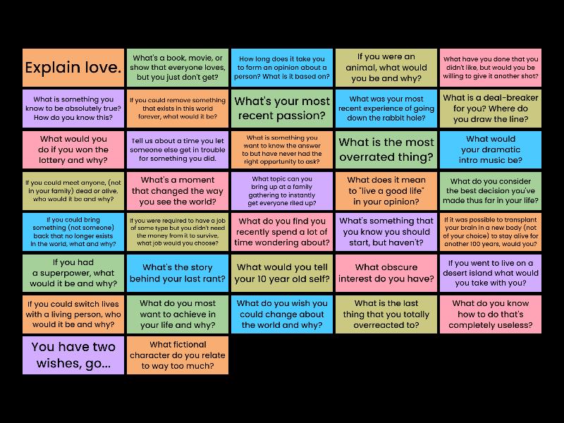 What would you do if you won the lottery and why?, If you were an animal, what would you be and why?, If you could switch lives with a living person, who would it be and why?, If you had a superpower, what would it be and why?, If you could meet anyone, (not in your family) dead or alive, who would it be and why?, What do you most want to achieve in your life and why?, If you went to live on a desert island what would you take with you?, What do you wish you could change about the world and why?, What is something you want to know the answer to but have never had the right opportunity to ask?, What's a book, movie, or show that everyone loves, but you just don't get?, What's your most recent passion?, What would you tell your 10 year old self?, What topic can you bring up at a family gathering to instantly get everyone riled up?, What have you done that you didn't like, but would you be willing to give it another shot?, What's the story behind your last rant?, What do you find you recently spend a lot of time wondering about?, Explain love., Tell us about a time you let someone else get in trouble for something you did., What would your dramatic intro music be?, What fictional character do you relate to way too much?, What do you consider the best decision you've made thus far in your life?, What is the last thing that you totally overreacted to?, You have two wishes, go..., What do you know how to do that's completely useless?, What's something that you know you should start, but haven't?, What does it mean to "live a good life" in your opinion?, What obscure interest do you have?, If it was possible to transplant your brain in a new body (not of your choice) to stay alive for another 100 years, would you?, If you were required to have a job of some type but you didn't need the money from it to survive, what job would you choose?, What was your most recent experience of going down the rabbit hole?, How long does it take you to form an opinion about a person? What is it based on?, If you could remove something that exists in this world forever, what would it be?, What is a deal-breaker for you? Where do you draw the line?, What is something you know to be absolutely true? How do you know this?, If you could bring something (not someone) back that no longer exists in the world, what and why?, What is the most overrated thing?, What's a moment that changed the way you see the world?,