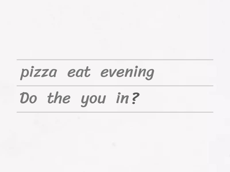 Do you eat pizza in the evening?, Does Mary watch TV at night?, Do you usually play football with your friends?, Does your dog always play with its toys?, Do they brush their teeth after lunch?, Does your cat climb trees in the park every day? , Do your parents often drive a car?, Does Tom listen to music in the morning?, Where does she live?, How often do you eat pasta?, Does he run every morning?, Do you go to school on Saturday?, Does Mary play the piano every week?,