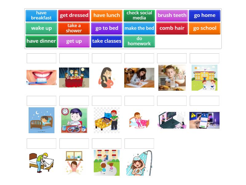 wake up, get up, make the bed, take a shower, get dressed, comb hair, have breakfast, brush teeth, go school, take classes, go home, have lunch, do homework, check social media, have dinner, go to bed,