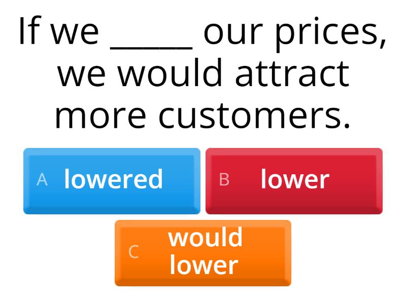 1) If we _____ our prices, we would attract more customers. a) lowered b) lower c) would lower 2) If our company invested in new technology, we _____ streamline our operations. a) can b) will c) could 3) If we _______ better customer service, we might retain more clients. a) would offered b) offered c) offer 4) If we ______ our market overseas, we ___________ increase our revenue. a) expanded/would b) expanded/will c) would expanded/would 5) Employees would be more productive if our they _________ more training. a) would receive b) received c) will receive 6) We ________ outperform our competitors if we _____ our marketing strategies. a) might/improved b) could/improve c) would/would improved 7) If we _______ a flexible work schedule, we could boost employee morale. a) implemented b) implement c) would implemented 8) We could enhance our online presence if we ______ our website. a) upgrade b) upgraded c) would upgrade 9) We _________ our reach if we established partnerships with other businesses. a) would broaden b) broadened c) would broadened 10) We _________ eco-conscious consumers if we _______ on sustainability. a) attract/focused b) might attracted/focus c) might attract/focused