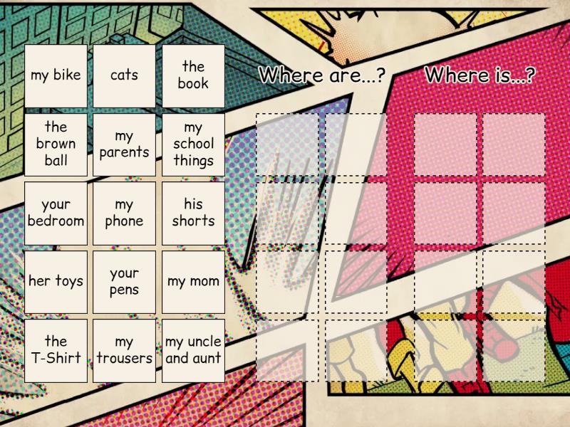Where are...?: my trousers, your pens, my parents, cats, his shorts, her toys, my school things, Where is...?: the book, the T-Shirt, the brown ball, my mom, my uncle and aunt, my bike, your bedroom, my phone,