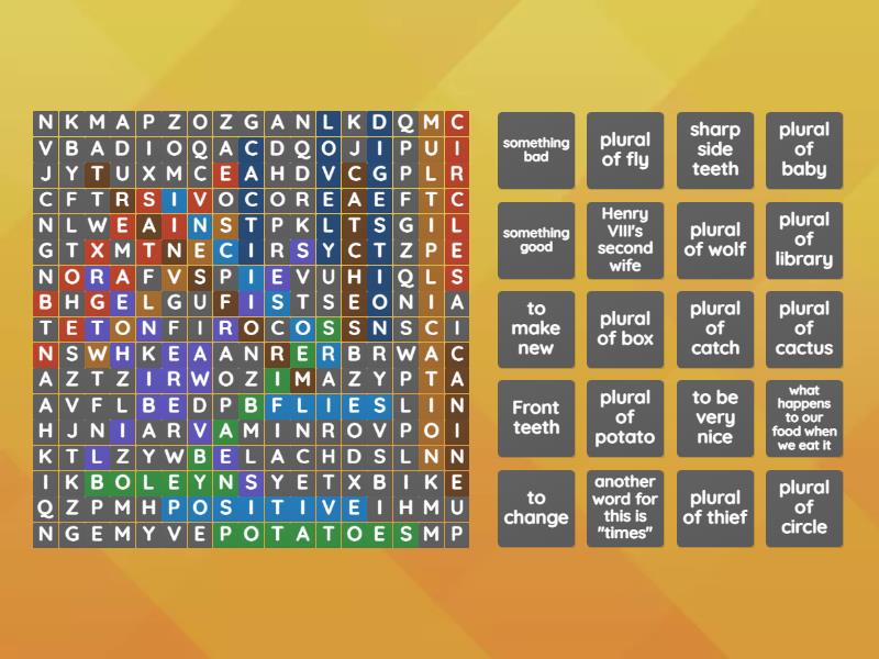 babies - plural of baby, thieves - plural of thief, boxes - plural of box, flies - plural of fly, catches - plural of catch, cacti - plural of cactus, wolves - plural of wolf, potatoes - plural of potato, libraries - plural of library, circles - plural of circle, incisor - Front teeth, canine - sharp side teeth, digestion - what happens to our food when we eat it, multiplication - another word for this is "times", Boleyn  - Henry VIII's second wife, renew - to make new, negative - something bad, positive - something good, transform - to change, lovely - to be very nice,