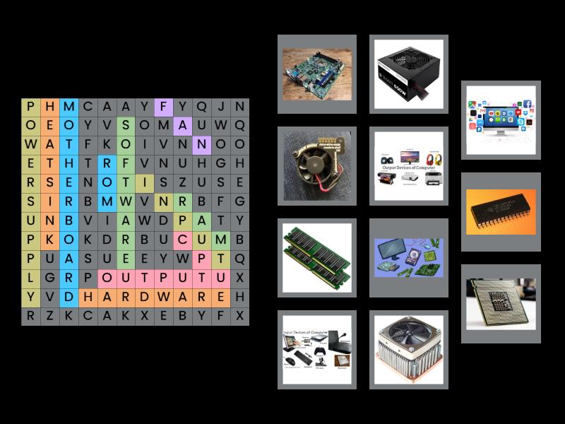 HARDWARE, SOFTWARE, MOTHERBOARD, POWERSUPPLY, CPU, FAN, HEATSINK, RAM, ROM, INPUT, OUTPUT,