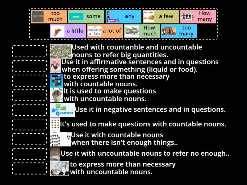How much - It is used to make questions with uncountable nouns., How many - It's used to make questions with countable nouns., too much - to express more than necessary with uncountable nouns., too many - to express more than necessary with countable nouns., a lot of - Used with countanble and uncountable nouns to refer big quantities., some - Use it in affirmative sentences and in questions when offering something (liquid or food)., any - Use it in negative sentences and in questions., a few - Use it with countable nouns when there isn't enough things.., a little - Use it with uncountable nouns to refer no enough..,