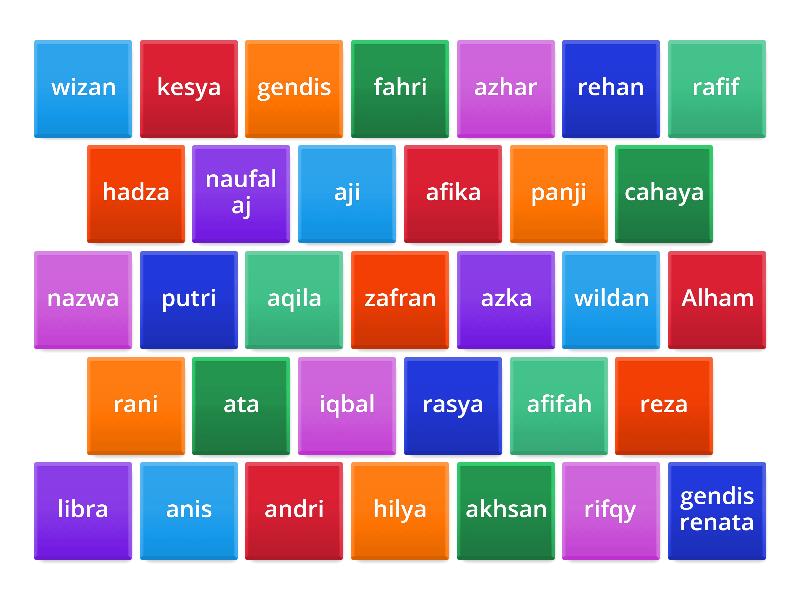 Alham, azhar, rani, nazwa, andri, rasya, azka, libra, akhsan, aqila, kesya, afifah, gendis, ata, reza, fahri, rifqy, panji, iqbal, hilya, afika, naufal aj, wizan, rehan, hadza, rafif, zafran, aji, anis, wildan, putri, gendis renata, cahaya,