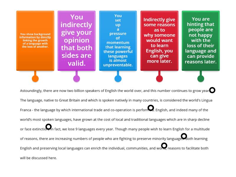 You set up a pressure of momentum that learning these powerful languages is almost unpreventable., Indirectly give some reasons as to why someone would want to learn English, you can give more later., You show background information by directly linking the growth of a language with the loss of another., You are hinting that people are not happy with the loss of their language and can provide reasons later., You indirectly give your opinion that both sides are valid..