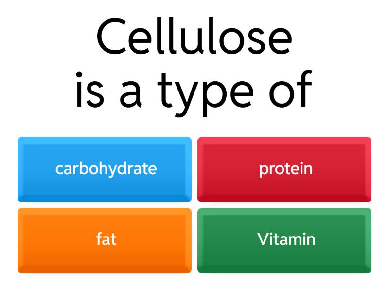 1) Cellulose is a type of a) carbohydrate b) protein c) fat d) Vitamin 2) _______________ is used to synthesise enzymes, hormones and antibodies. a) carbohyrate b) Fat c) Protein d) Fibre 3) _____________is stored under the skin as a heat insulator. a) Protein b) Fat c) Mineral d) Fibre 4) ___________is important to prevent constipation. a) Protein b) Fat c) Fibre d) Mineral 5) Which of the following is not the end product of digestion? a) Fatty acids b) Starch c) Amino Acids d) Glucose 6) Lacteal in the villi absorbs________________ a) Vitamin B b) Glucose c) Amino acids d) Fatty acids 7) Process of elimination of faeces from the body is called____________ a) assimilation b) constipation c) defecation d) digestion 8) Visking tube represent _____________ in human body. a) stomach b) large intestine c) small intestine d) blood stream 9) Fibre can be digested. a) True b) False 10) ______________ is the test for protein. a) Iodine test b) Milon's test c) Benedict's test